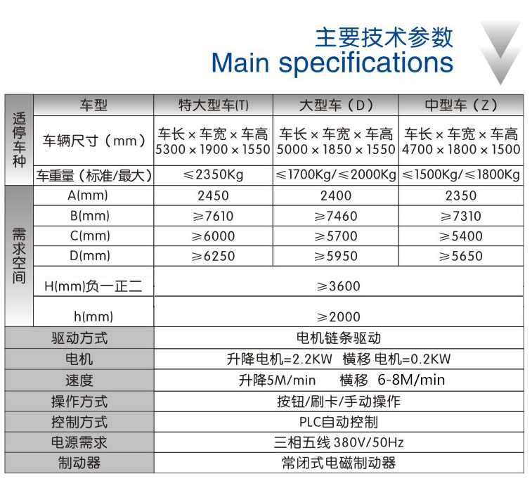带基坑三层升降横移 运行原理 该设备的顶层载车板可上下升降;基坑层载车板可上下升降;地面层载车板做横移,地面层留有一个空位,可以通过横移载车板变换空位,使空位正上或下方的载车板下降或上升到地面层。地